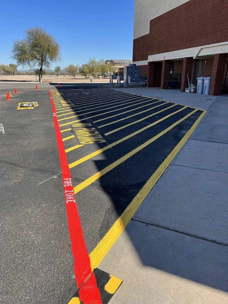 Empty parking lot with yellow striped parking spaces, a red fire zone line, and orange traffic cones, outside a brick building on a sunny day.